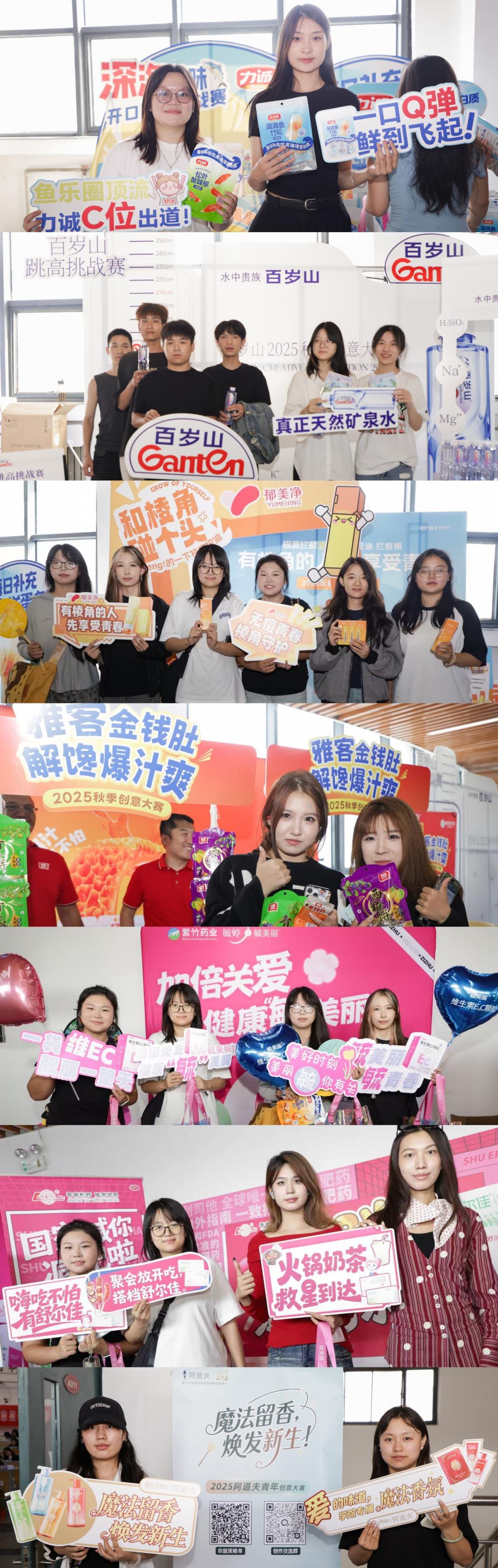 整场活动氛围高涨,观众爆满。场内问答互动环节反响热烈,趣味互动、礼物发放将现场气氛推向高潮。场外的展示区同样引来大量同学停留。一个个品牌展位变身“校园热门打卡点”,同学们纷纷停下脚步拍照、加入品牌小游戏,近距离了解品牌文化。学生通过打卡、互动亲身感受品牌运作模式,将抽象概念转化为具体体验。这一沉浸式交流,使产教融合不再停留在理论层面,而是成为可感知、可参与的实践,这进一步点燃了学生的创新灵感。