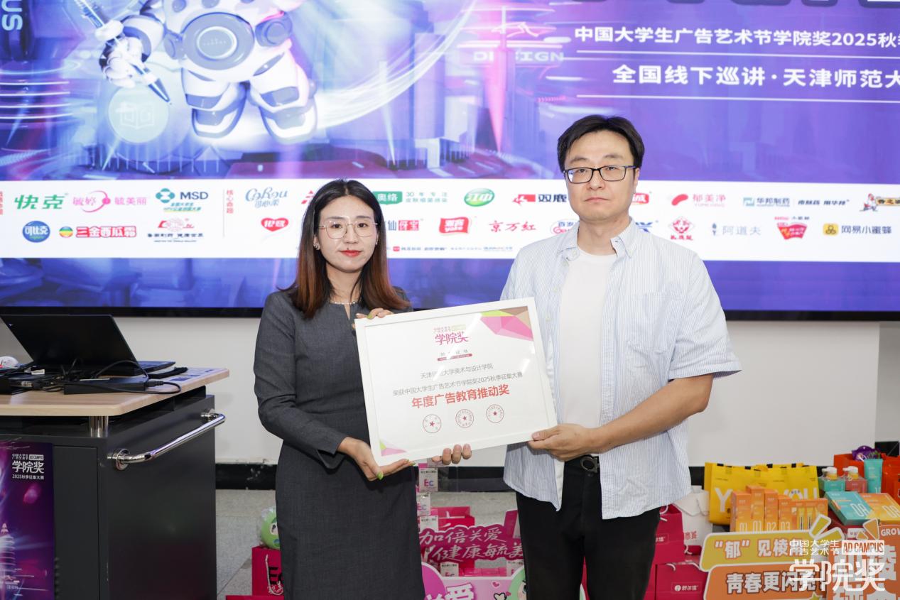 随后,何晓影女士为天津师范大学美术与设计学院颁发“大学生广告艺术节学院奖2025秋季征集大赛·广告教育推动奖”证书,副院长贾潍教授代表学院接受学院奖组委会授牌,以表彰其在深化产教融合、创新教学模式方面所取得的战略性成果。
