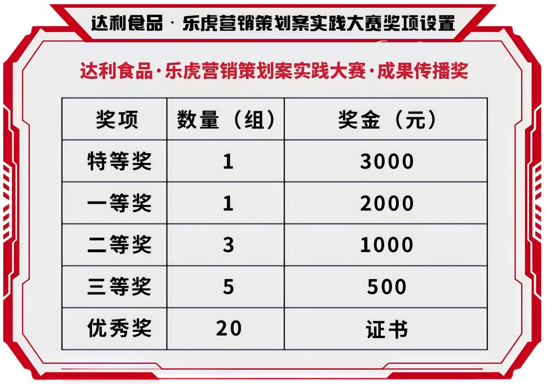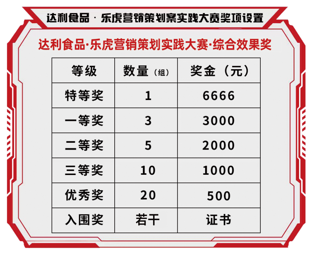 今年大赛主题为“乐虎接力 能量不停”,鼓励大学生以破圈传播的方式玩转品牌,以500ml瓶装乐虎为参赛产品,融入乐虎“一元乐享”机制,引发病毒式传播事件,实现乐虎品牌理念的深度渗透,以及”一元乐享“的品牌破圈传播。