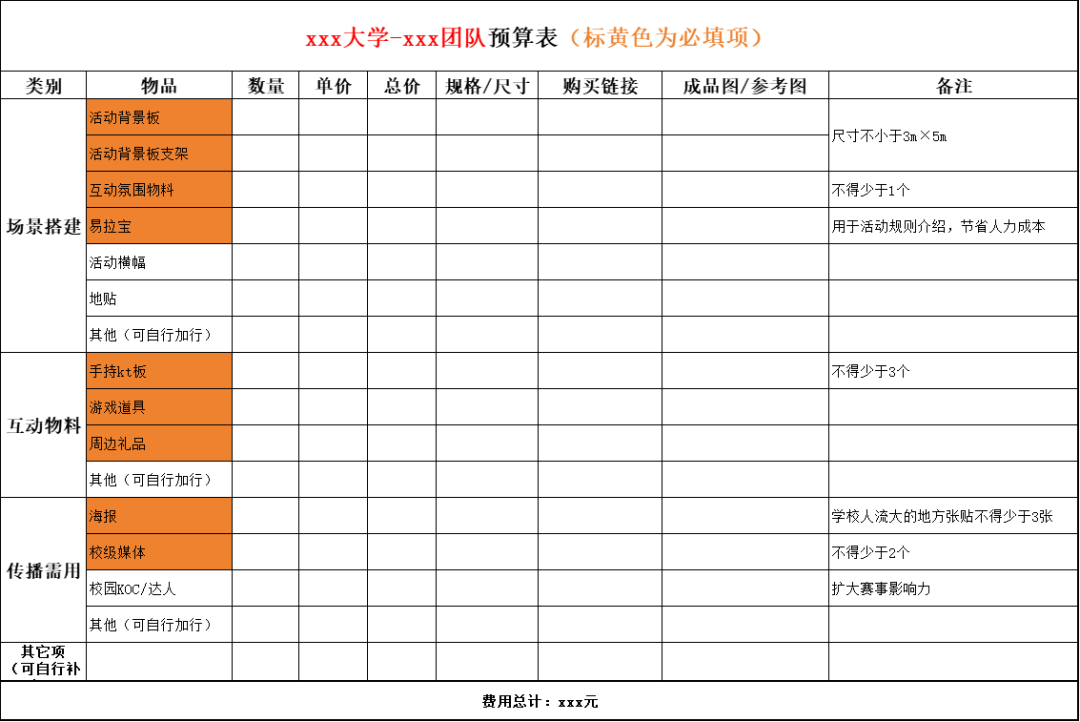 策划案预算表需按照模版制作,落地费用合理控制在3000元之内,具体模板文件见大赛创作素材包。