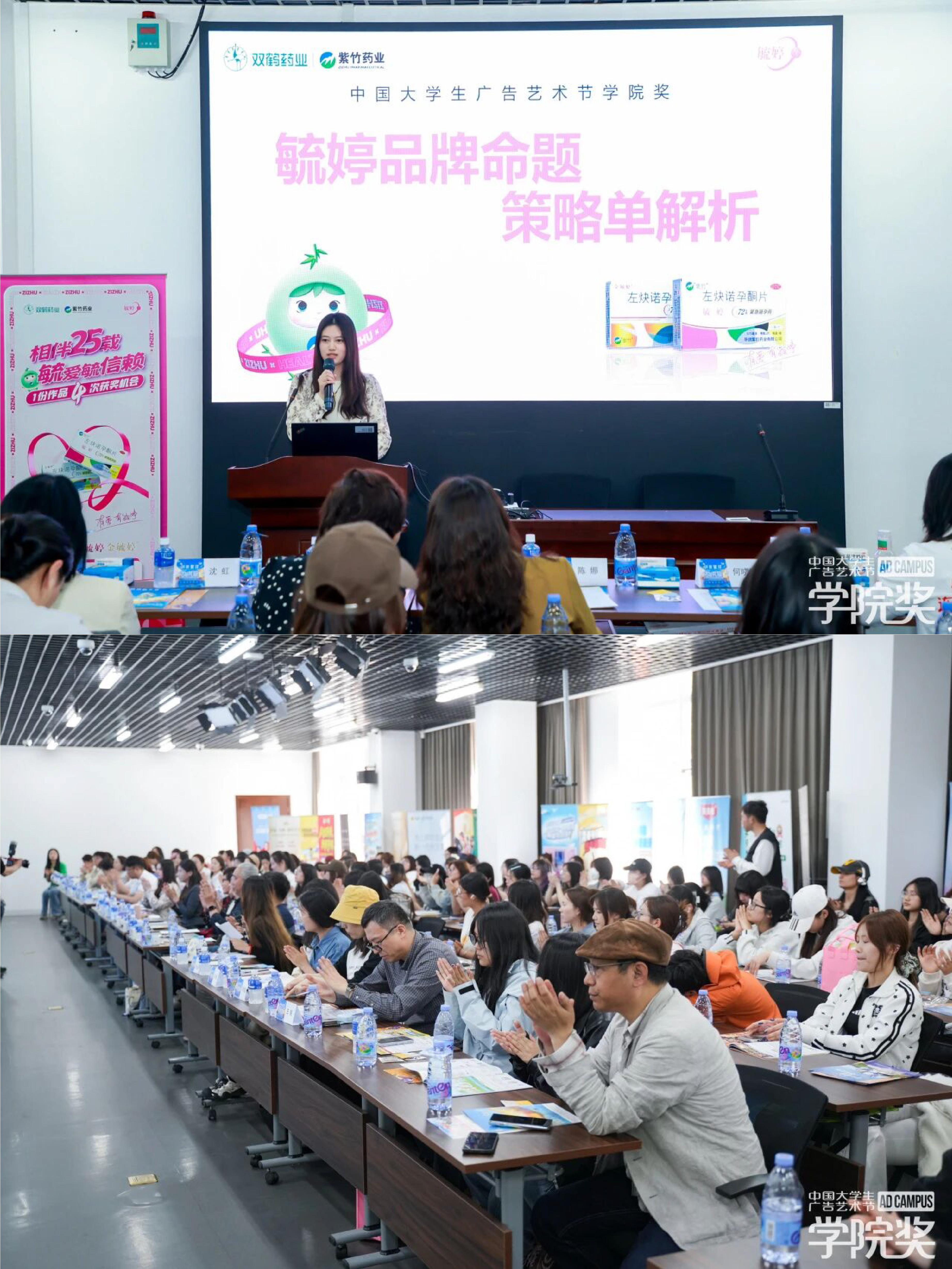 本届赛事毓婷以“相伴25载,毓爱毓信赖”为核心主题,特别设置平面广告、短视频、微电影、营销策划、广告文案、IP形象及衍生品设计六大创作类别,为青年创作者搭建起多元开放的创意舞台。课堂上,毓婷代表从品牌视角出发,逐层拆解命题策略单,结合往届佳作的创作思路与亮点,为在场学子拨开灵感迷雾,点亮表达路径。为点燃创作热情,毓婷还增设“紫竹创意新锐奖”“抖音人气奖”“毓荐人气奖”三项专属奖项,鼓励更多优质创意涌现。